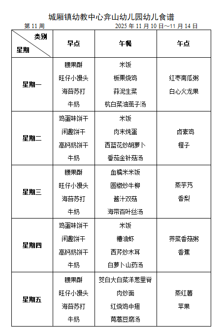 弇山幼儿园第十一周幼儿食谱
