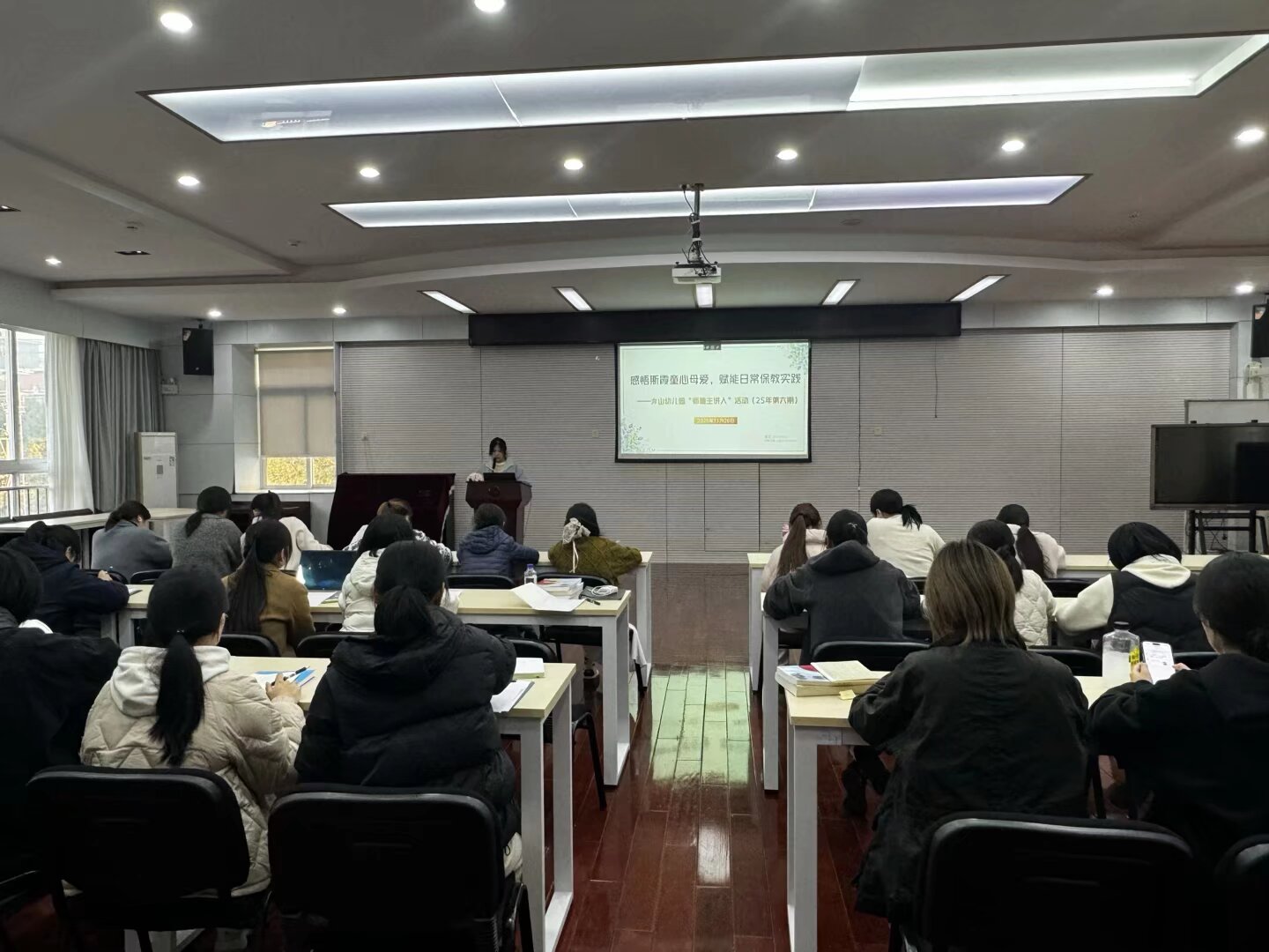 人无精神则不立,国无精神则不通。教育家精神是宝贵的精神财富,具有强大的道德感染力、价值引领力和实践驱动力。为引导全体教师深刻理解教育家精神的专业内涵,促进教师的专业成长,2025年11月26日,弇山幼儿园全体教师集中多功能厅,开展“感悟斯霞童心母爱,赋能日常保教实践”25年第六期“师德主讲人”活动。