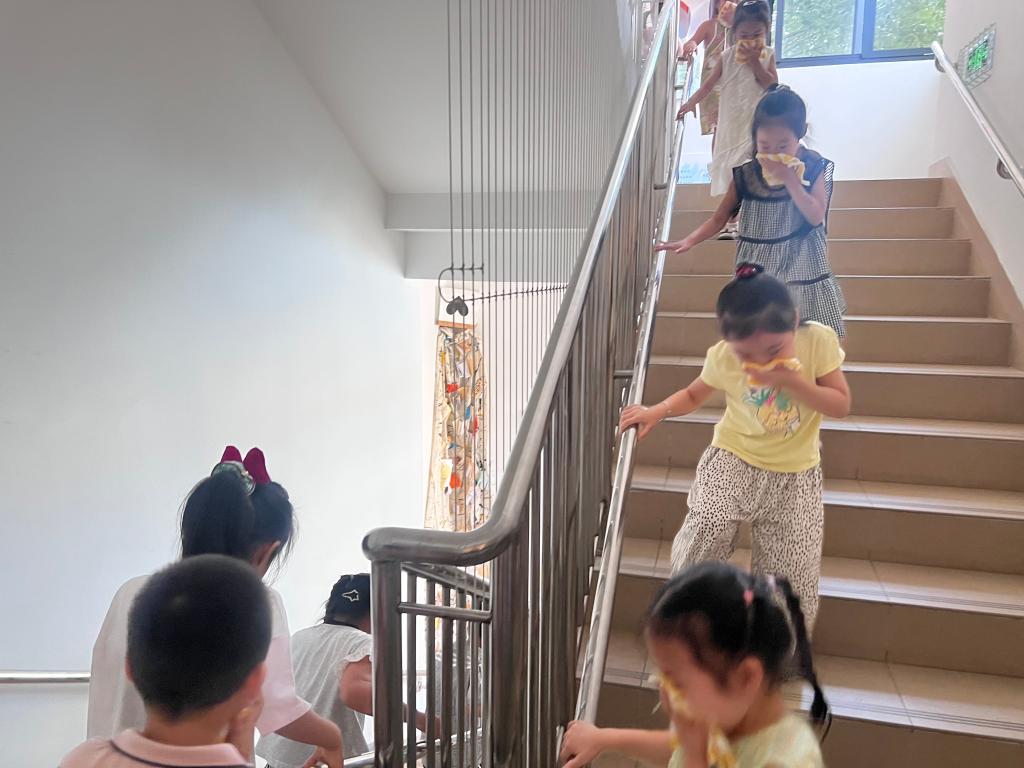 随着急促的警报声响起,小班全体幼儿刚入园几天,但是也在老师的带领下有序地撤离到校园户外安全场地;中、大班全体幼儿听从指挥,捂住口鼻、弯腰躬身,快速有序地跟随老师按照疏散路线,分主楼梯、辅楼梯安全疏散。中、大班全体教职工和幼儿都安全地撤离到了幼儿园对面的停车场,达到了预期目标。演练结束后,各班教师及时清点人数,确保无一人遗漏,并向安全负责人汇报情况。