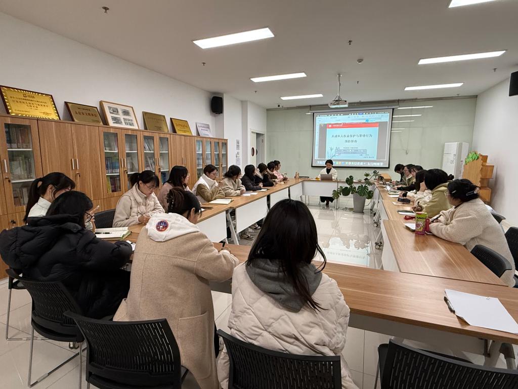 2025年11月18日,太仓市城厢镇幼教中心新毛幼儿园于会议室开展了2025年教师安全法治教育培训。本次培训通过线上聆听姚荣教授的讲座,提升全体教师对未成年人保护法律体系与罪错行为预防矫治机制的理解与应用能力,强化校园安全管理水平,切实保障未成年人健康成长。