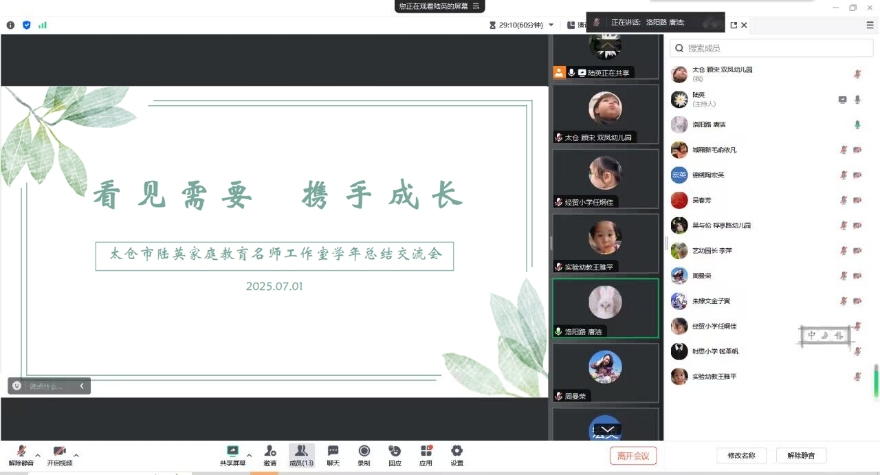 2025年7月1日,“合理期望导向下的幼小全程衔接家长课程的开发研究”课题组成功举办了以“看见需要 携手成长”为主题的学期总结与学习活动。本次活动旨在通过前沿理论研读、一线案例剖析与年度成果复盘,进一步明晰家长入学准备认知的核心影响,探索精准家教指导路径,为课题的纵深推进凝聚共识、积蓄力量。