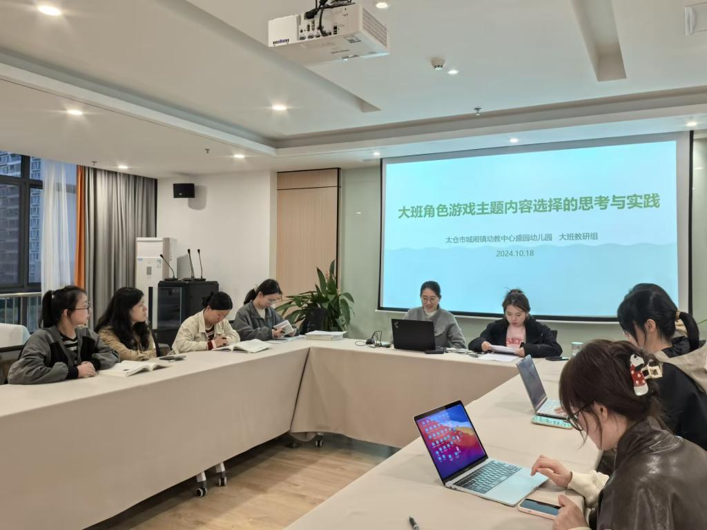 2024年10月18日下午,太仓市城厢镇幼教中心盛园幼儿园大班教研组全体教师在教研组长的带领下关于开展了系列教研活动之“大班角色游戏主题内容选择的思考与实践”。