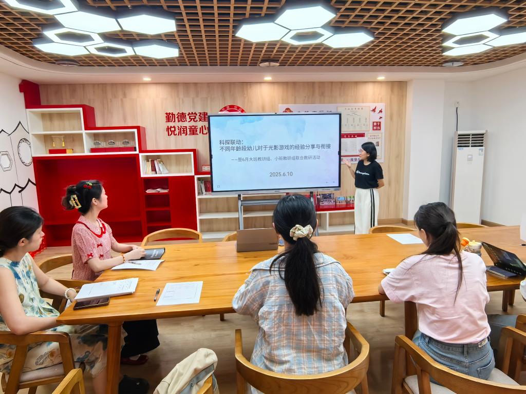 2025年6月10日,盛园幼儿园小班教研组和大班教研组围绕“不同年龄段幼儿对于光影游戏的经验分享与衔接”开展联合教研活动。本次联合教研聚焦小班、大班幼儿科学探究能力发展的年龄差异,旨在通过“同材异构”的深度研讨,提升教师对科学探究类游戏的设计与指导能力。通过自制教玩具游戏的观摩与研讨,完善科探区活动资源表,优化科探区材料配置。