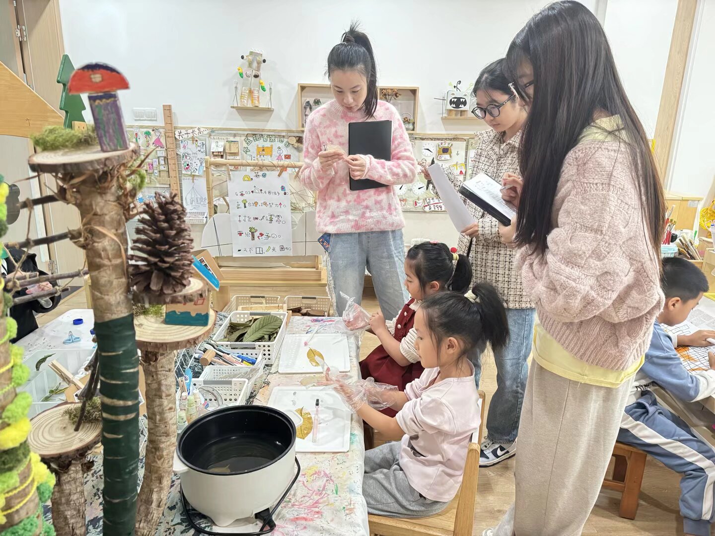 上午现场观察记录环节,空班教师以走班形式进入对应大班活动室,在不干扰幼儿游戏的前提下开展观察记录。教师们运用扫描观察法快速捕捉全班幼儿探究行为分布,通过定点观察聚焦科探区等区域的互动细节,借助追踪观察深度分析1-2名幼儿的探究过程,为后续研讨积累了丰富的实践素材。