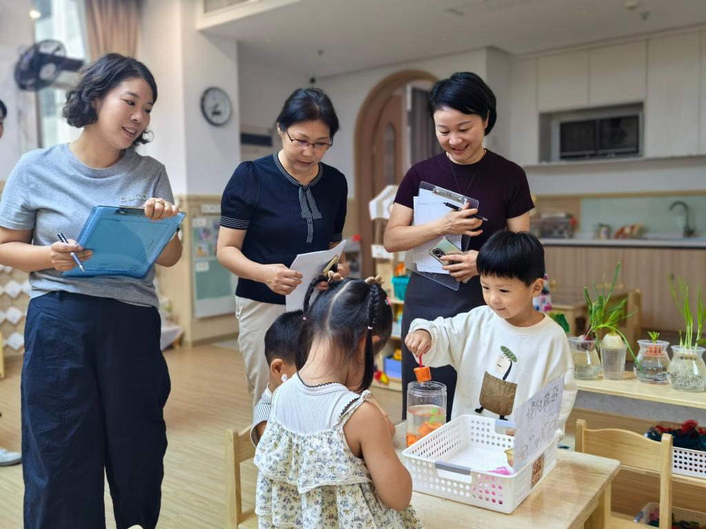 调研人员现场观摩了元美幼儿园班级半日活动,聚焦半日活动组织、环境创设、课程建设、一日作息时间弹性管理、幼儿园室内外空间管理、生活环节的教育价值以及保育工作情况等,进行了深入的交流与研讨,反馈了班级的亮点和存在的问题,并提出了多项具体、可行且针对性强的改进建议。